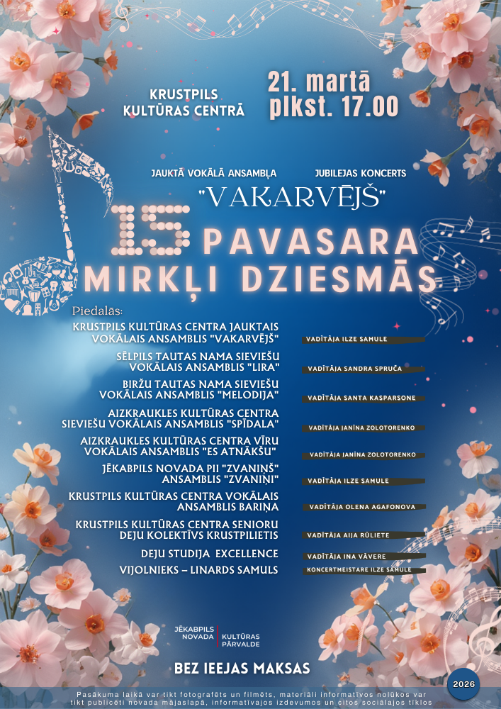 Savukārt sestdien, 21. martā, pulksten 17:00 Krustpils kultūras centru pieskandinās jauktais vokālais ansamblis “Vakarvējš”. Kolektīvam šogad aprit 15 gadu jubileja, un tai par godu dziedātāji dāvās koncertu “15 pavasara mirkļi dziesmās”. Katrs gads ansambļa dzīvē bijis kā pavasaris – gan ar jaunām dziesmām, gan jauniem dalībniekiem.