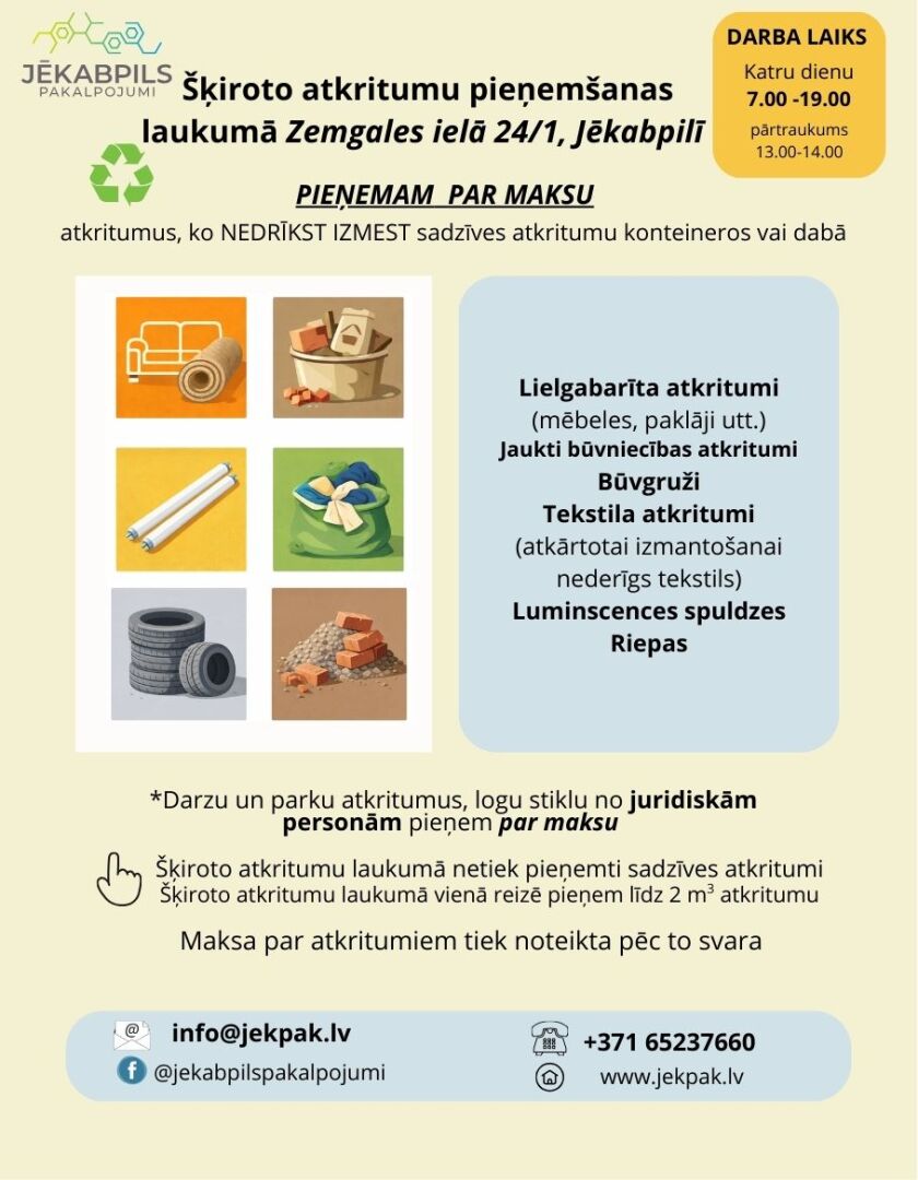Būvgružus var nodot SIA “Jēkabpils pakalpojumi” šķiroto atkritumu pieņemšanas laukumā, Zemgales ielā 24/1, Jēkabpilī.