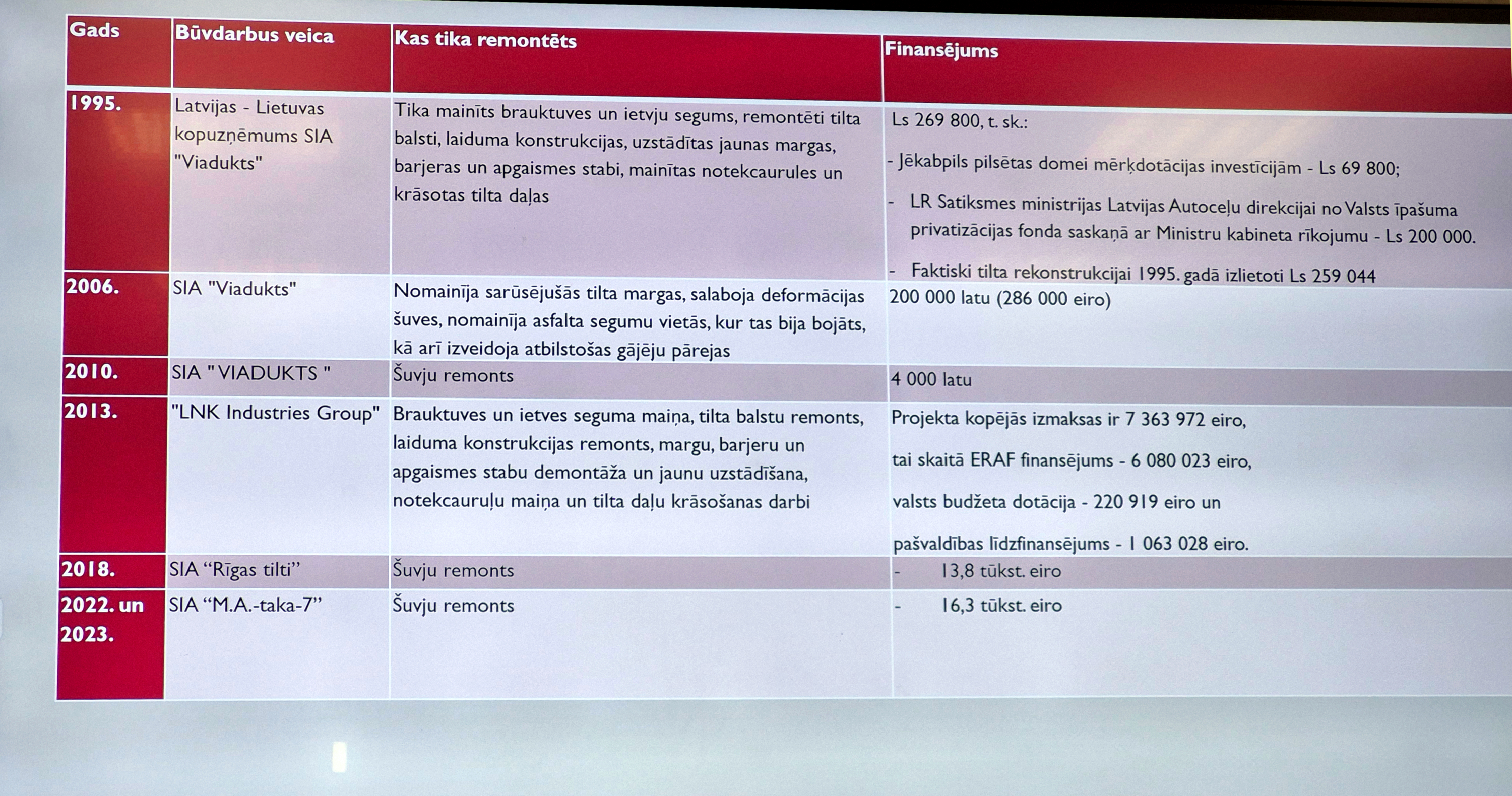 Iepriekšējos gados, kad šuves tika labotas, vietvarā uzsvēra, ka tas ir tikai pagaidu remonts. Pašvaldībā skaidro, ka šāds variants tika izvēlēts gan līdzekļu trūkuma dēļ, gan tāpēc, lai satiksmes ierobežojumi būtu pēc iespējas mazāki.