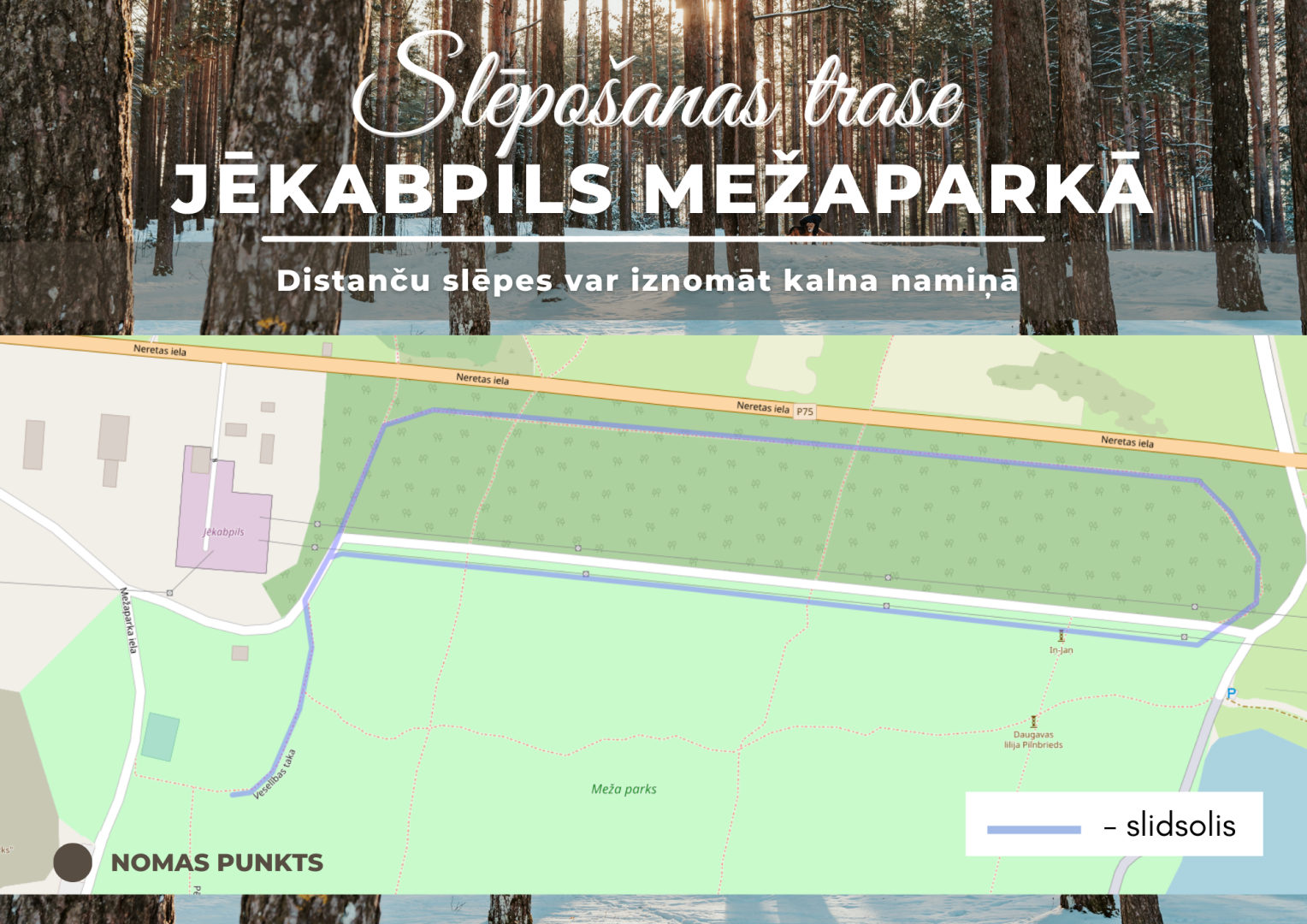 Jēkabpils Mežaparkā ir sagatavota slēpošanas trase slidsolim. Ja laika apstākļi ļaus, drīzumā varētu tikt izveidota trase arī klasiskajam stilam. Apmeklētāji aicināti nestaigāt pa sagatavoto slēpošanas trasi, kā arī slēpes uzvilkt otrpus ceļam, lai ceļa sāls nebojātu slēpju slīdvirsmu.