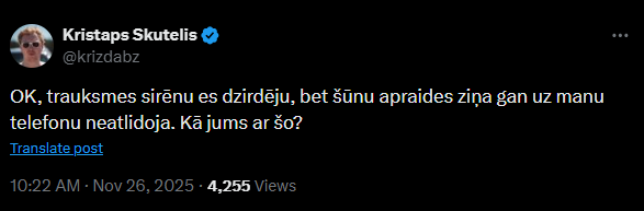 26. novembra rītā Latvijā tika pārbaudīta valsts agrīnās brīdināšanas sistēma. Valsts ugunsdzēsības un glābšanas dienests iedarbināja trauksmes sirēnas, lai novērtētu to tehnisko gatavību.