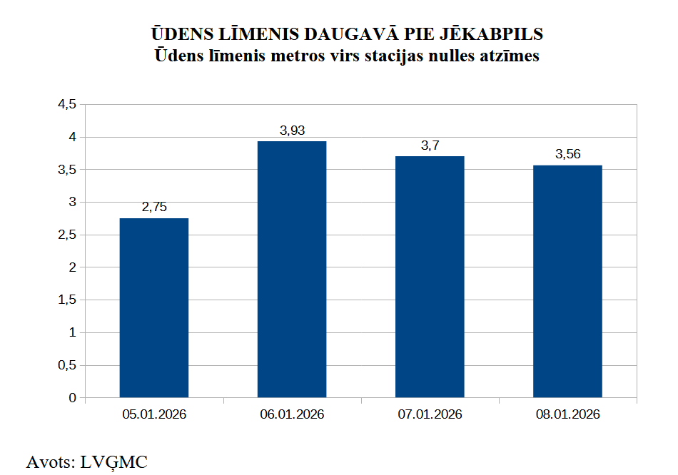 Sals veicināja ūdens līmeņa pakāpenisku krišanos, un šodien Daugavā pie Jēkabpils līmenis virs stacijas nulles atzīmes sasniedza 3,56 metrus. Tas ir vairāk nekā divus metrus zem dzeltenā brīdinājuma līmeņa pilsētā – seši metri virs stacijas nulles atzīmes.